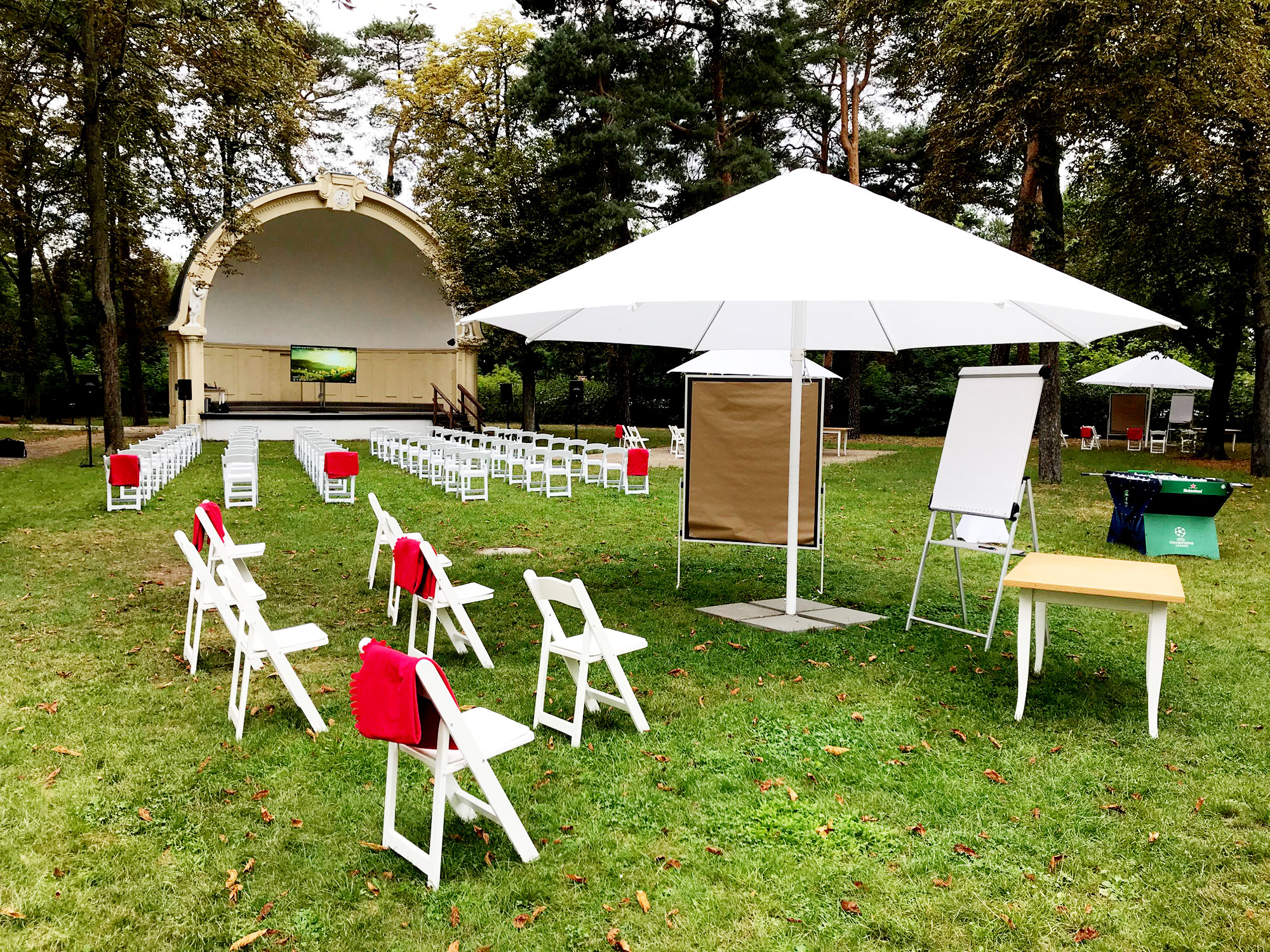 Ob im Grünen unter hohen Bäumen, auf der Terrasse oder in der geschützten Konzertmuschel, die Bühne für Sommerkonzerte, Impulsvorträge oder Live-Musik sein kann – hier wird euer Teamevent zur lebendigen Erfahrung. Der weitläufige Garten lädt dazu ein, gemeinsame Aktivitäten wie Bogenschießen, Outdoor-Games und Bewegungseinheiten zu integrieren, die Teamgeist stärken und Energie freisetzen.