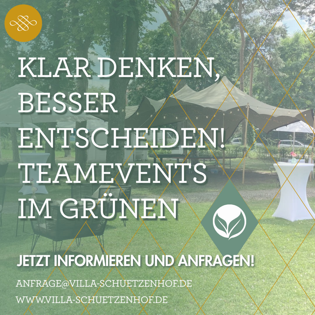 Mitten in Spandau, wo Stadt und Natur aufeinandertreffen, bietet die Villa Schützenhof den perfekten Ort für Incentives, Teamevents und Firmenveranstaltungen, die mehr bewegen als nur ein „offsite“. Auf einem 3.500 m² großen Villengarten mit altem Baumbestand und historischer Konzertmuschel schaffen wir Raum für echte Begegnungen, frische Ideen und gemeinsame Erlebnisse fernab vom Büroalltag – nach unserem Motto: „Klar denken, besser entscheiden!“.